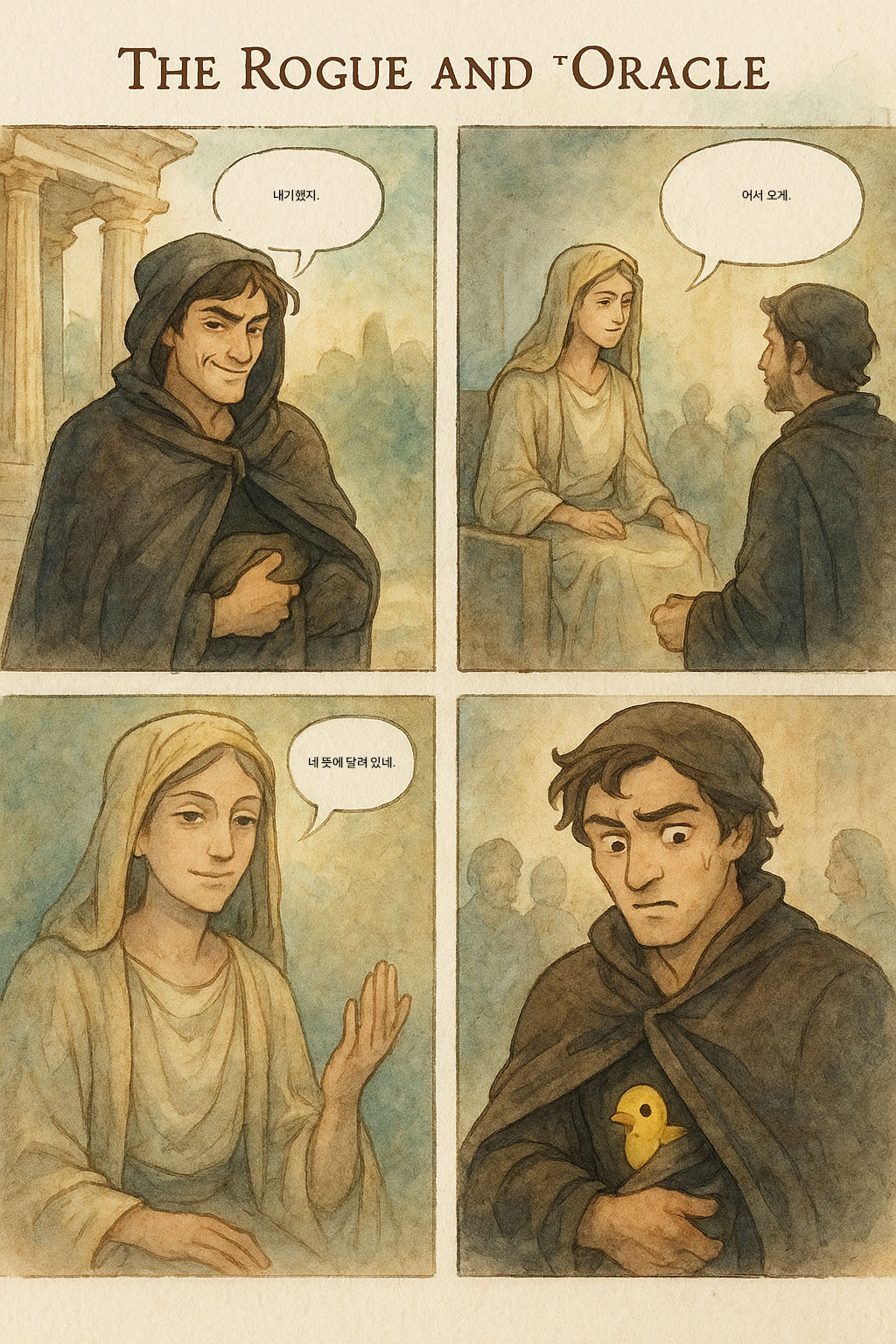 한 도적이 델포이의 신탁(오라클)이 거짓된 답을 한다는 것을 증명하겠다고 내기했다.