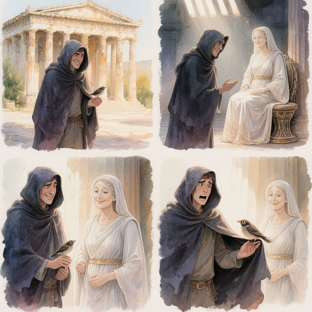 그는 소매 속에 작은 새를 숨긴 채 약속된 날 신전으로 가서, 신탁에게 자신이 손에 쥐고 있는 것이 살아 있느냐 죽어 있느냐고 물었다.
