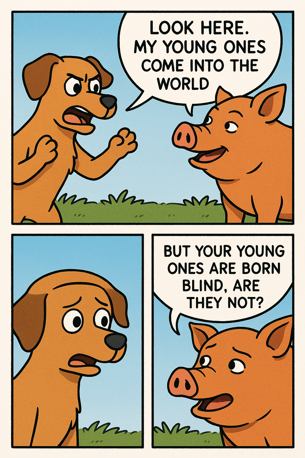 犬と雌ブタが言い争いをして、それぞれ自分の子どもが他のどんな動物の子どもよりも優れていると主張しました。