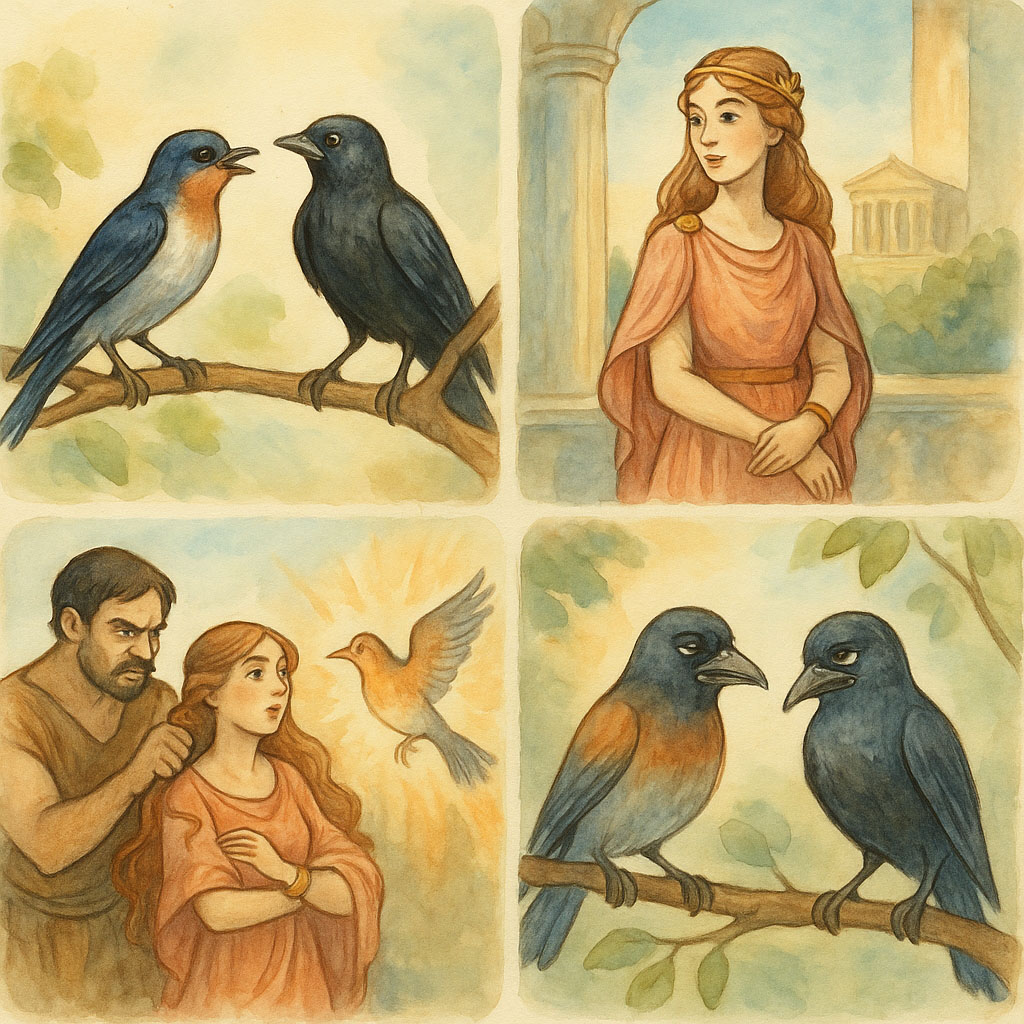 ある日、ツバメがカラスに自分の出自を自慢した。
