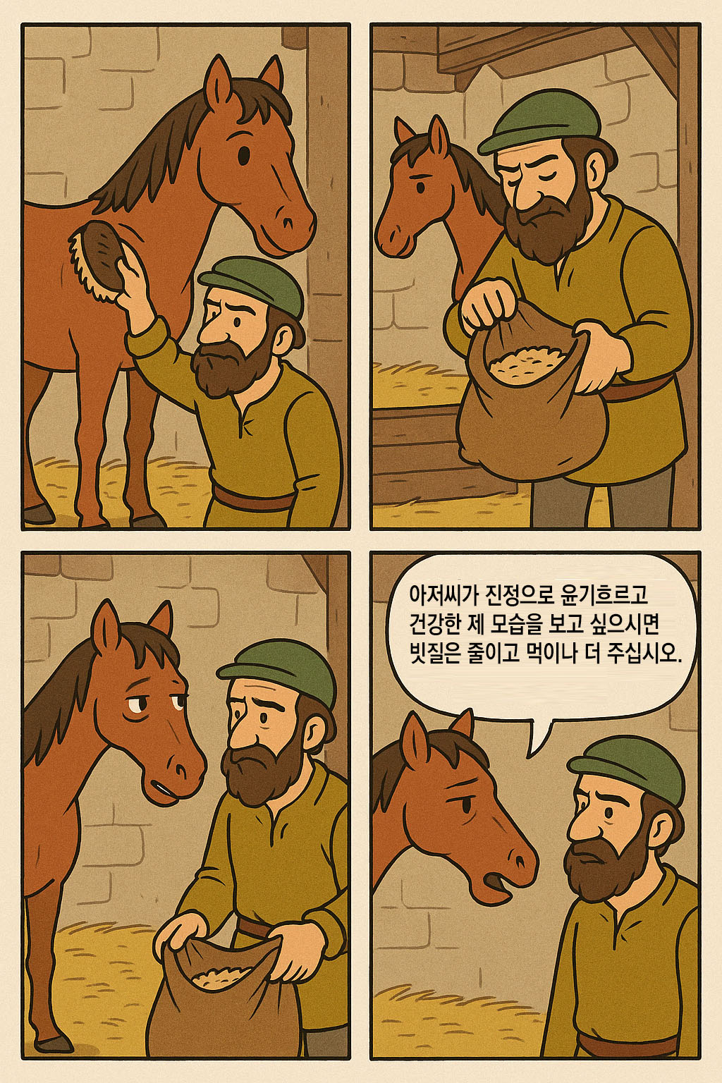 옛날에 자기가 맡은 말의 털을 골라주고 빗겨주는 일에 많은 시간을 바친 마부가 한명 있었습니다.