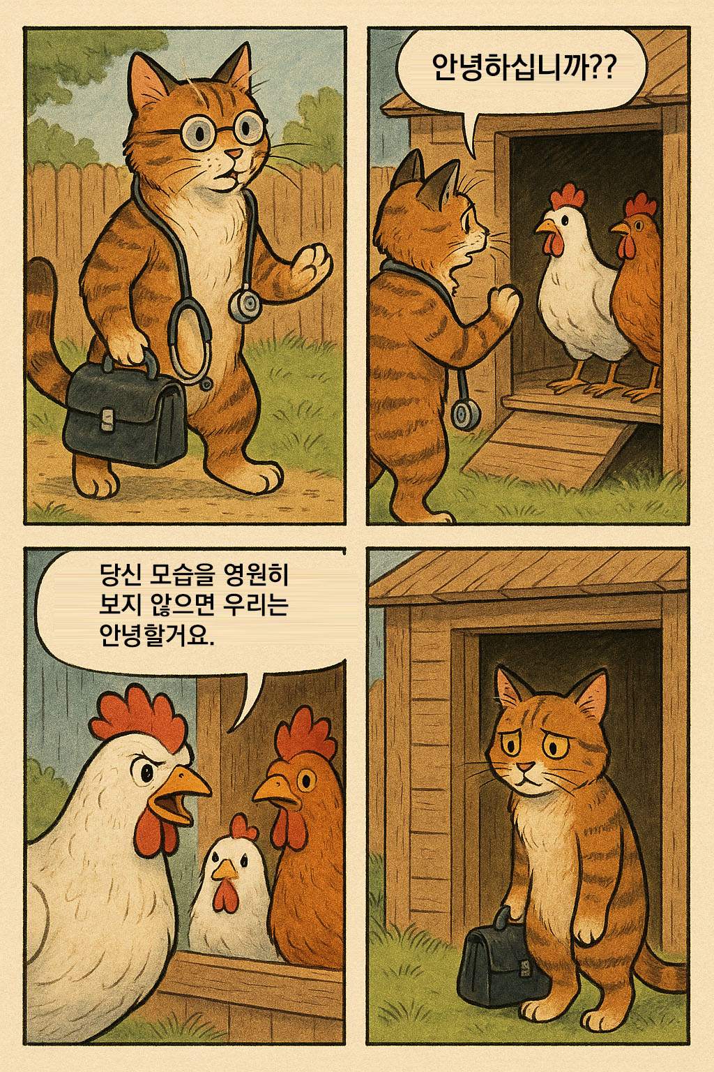 닭 농장의 닭들이 앓고 있다는 말을 고양이가 들었습니다.