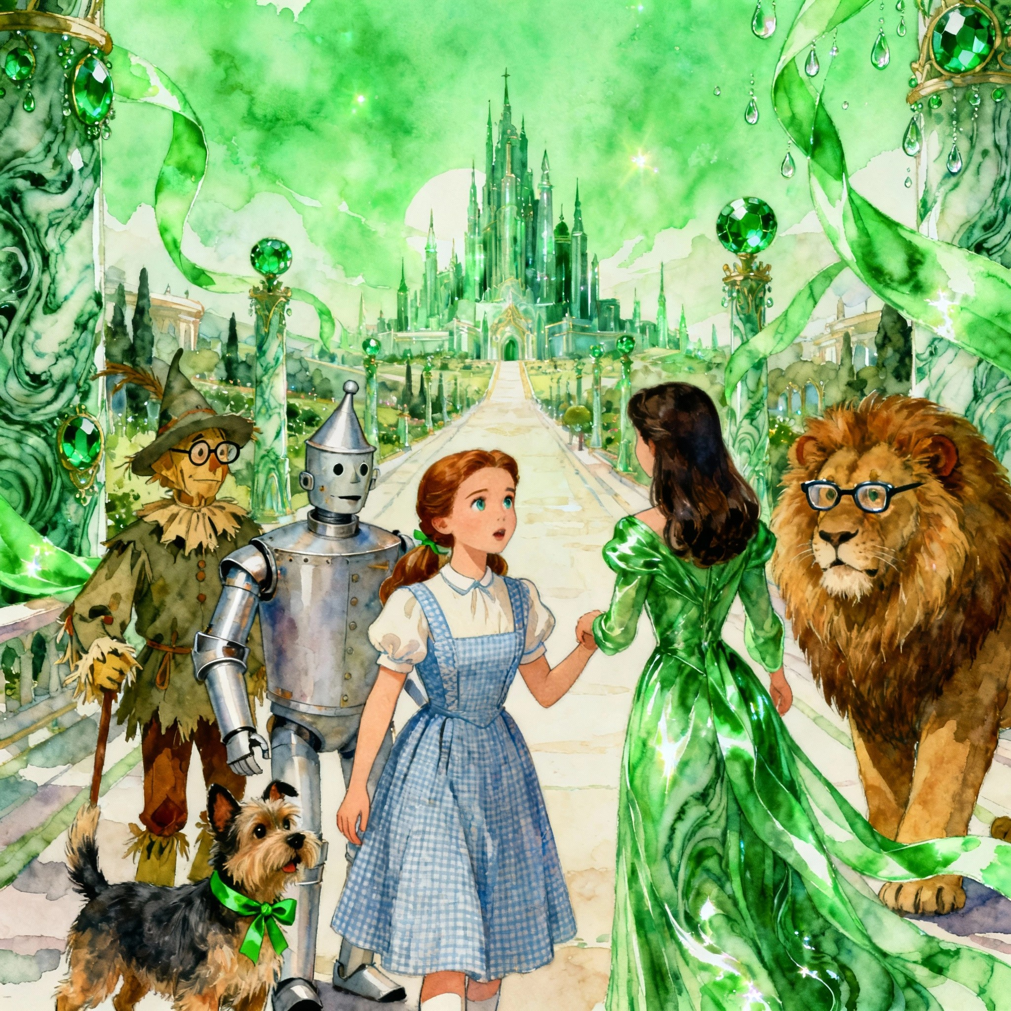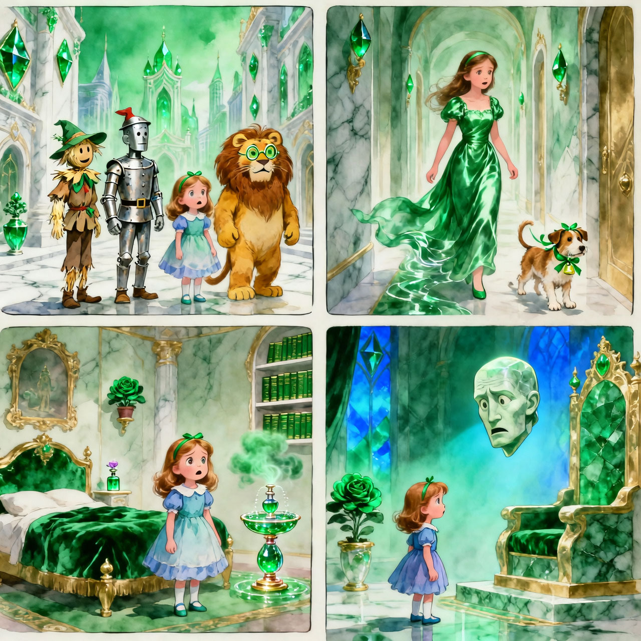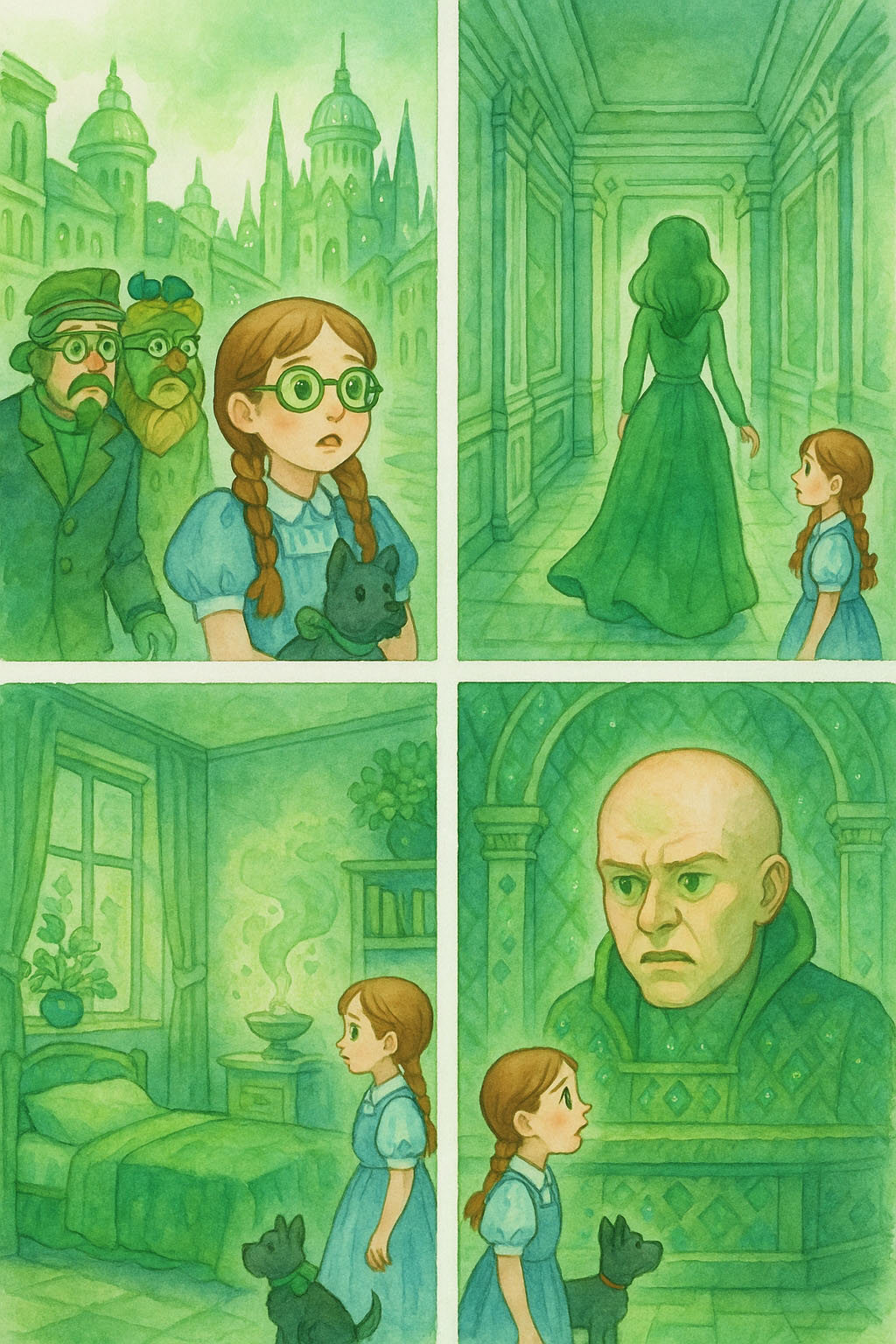 翌朝、緑の少女がドロシーを迎えに来た。ドロシーは緑のブロケードサテンで作られた最も美しいドレスの一つを着せてもらった。緑の絹のエプロンを身につけ、トトの首には緑のリボンを結んで、彼らは偉大なるオズの玉座の間へ向かった。