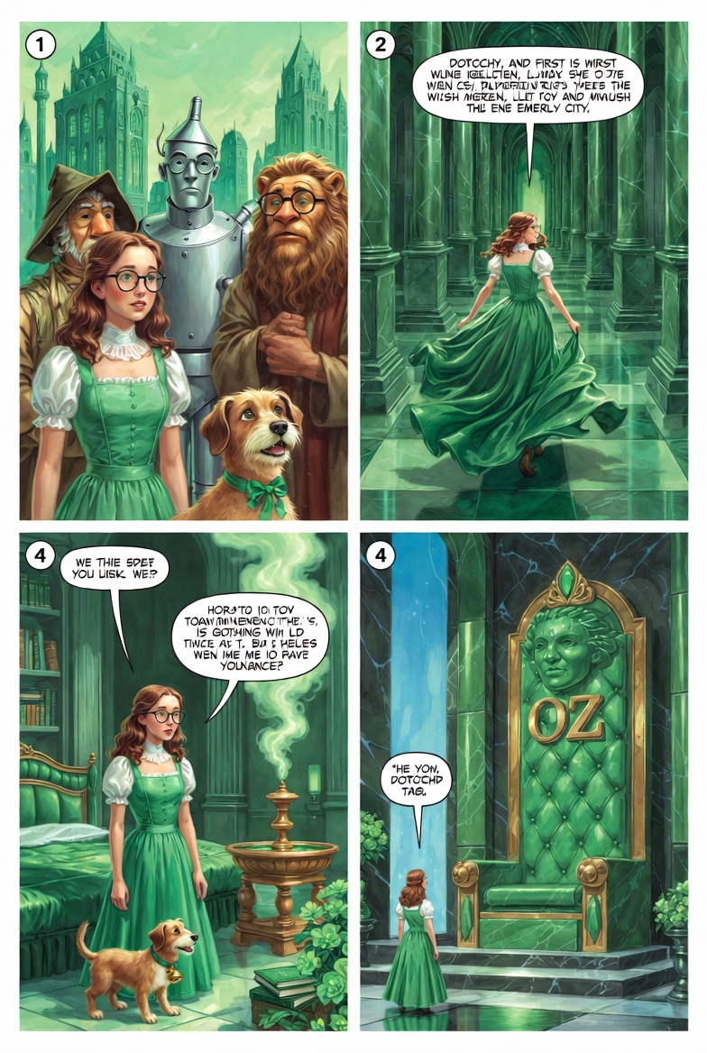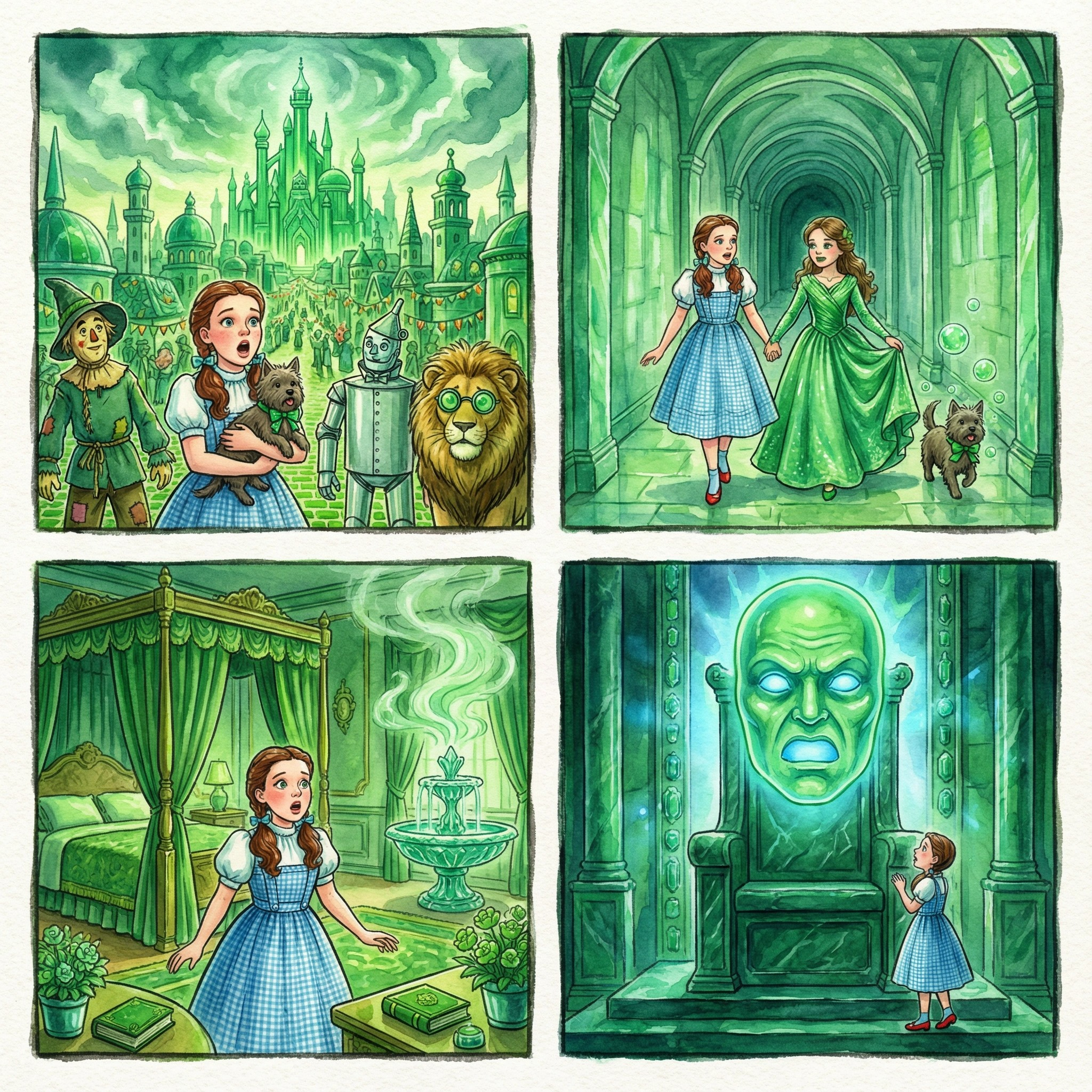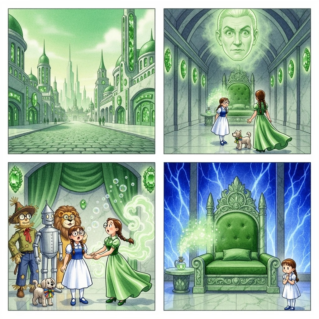 翌朝、緑の少女がドロシーを迎えに来た。ドロシーは緑のブロケードサテンで作られた最も美しいドレスの一つを着せてもらった。緑の絹のエプロンを身につけ、トトの首には緑のリボンを結んで、彼らは偉大なるオズの玉座の間へ向かった。