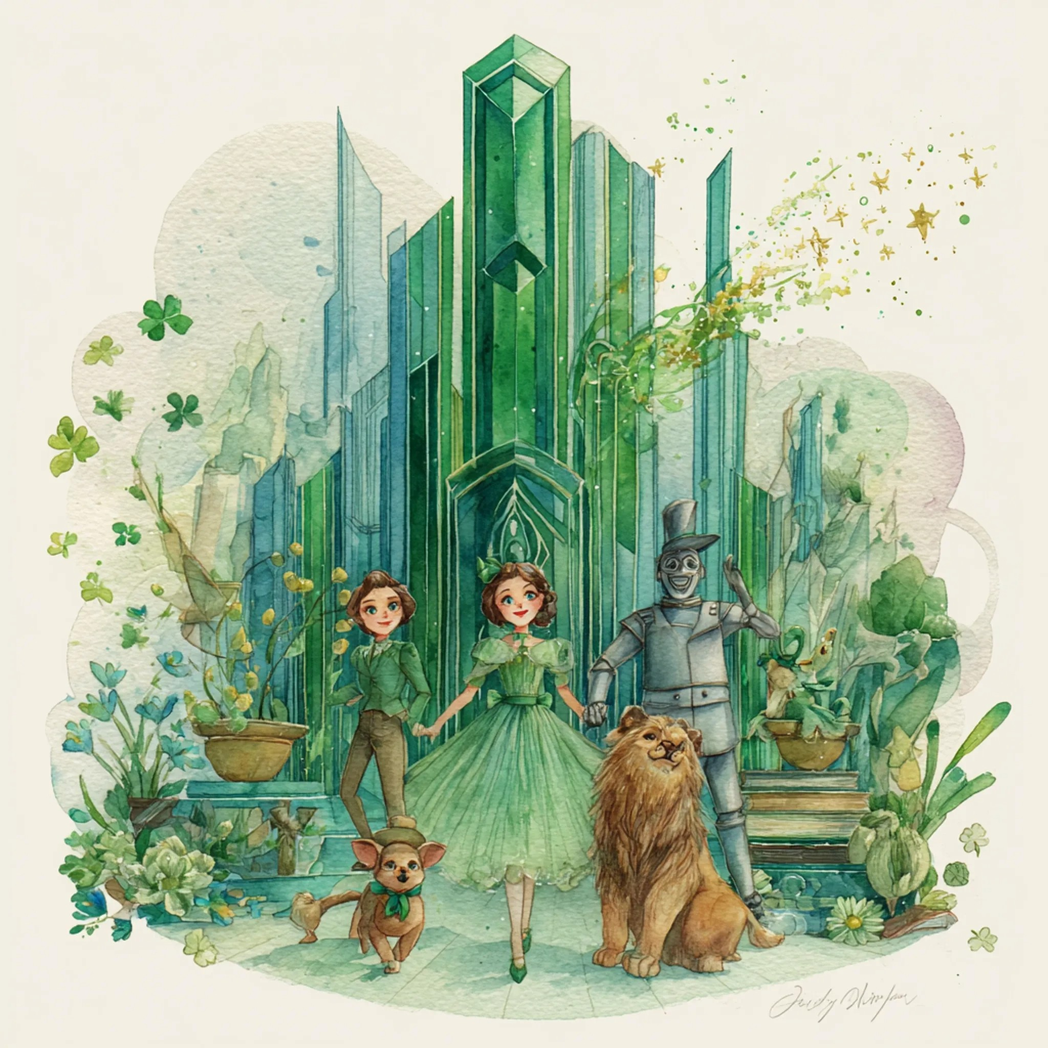 초록색 안경으로 눈이 보호되어 있었음에도 불구하고, 도로시와 친구들은 처음에 그 놀라운 도시의 찬란함에 눈이 부셔버렸다. 거리들은 아름다운 집들로 늘어서 있었고, 그 집들은 모두 초록 대리석으로 지어졌으며 여기저기 반짝이는 에메랄드로 장식되어 있었다. 그들은 같은 초록 대리석으로 된 포석 위를 걸어갔고, 대리석 블록이 이어지는 곳곳에는 에메랄드가 촘촘히 박혀 있어 햇빛 아래 반짝였다. 창문 유리는 초록색 유리였고, 심지어 도시 위의 하늘도 초록빛을 띠었으며, 태양의 광선도 초록색이었다.