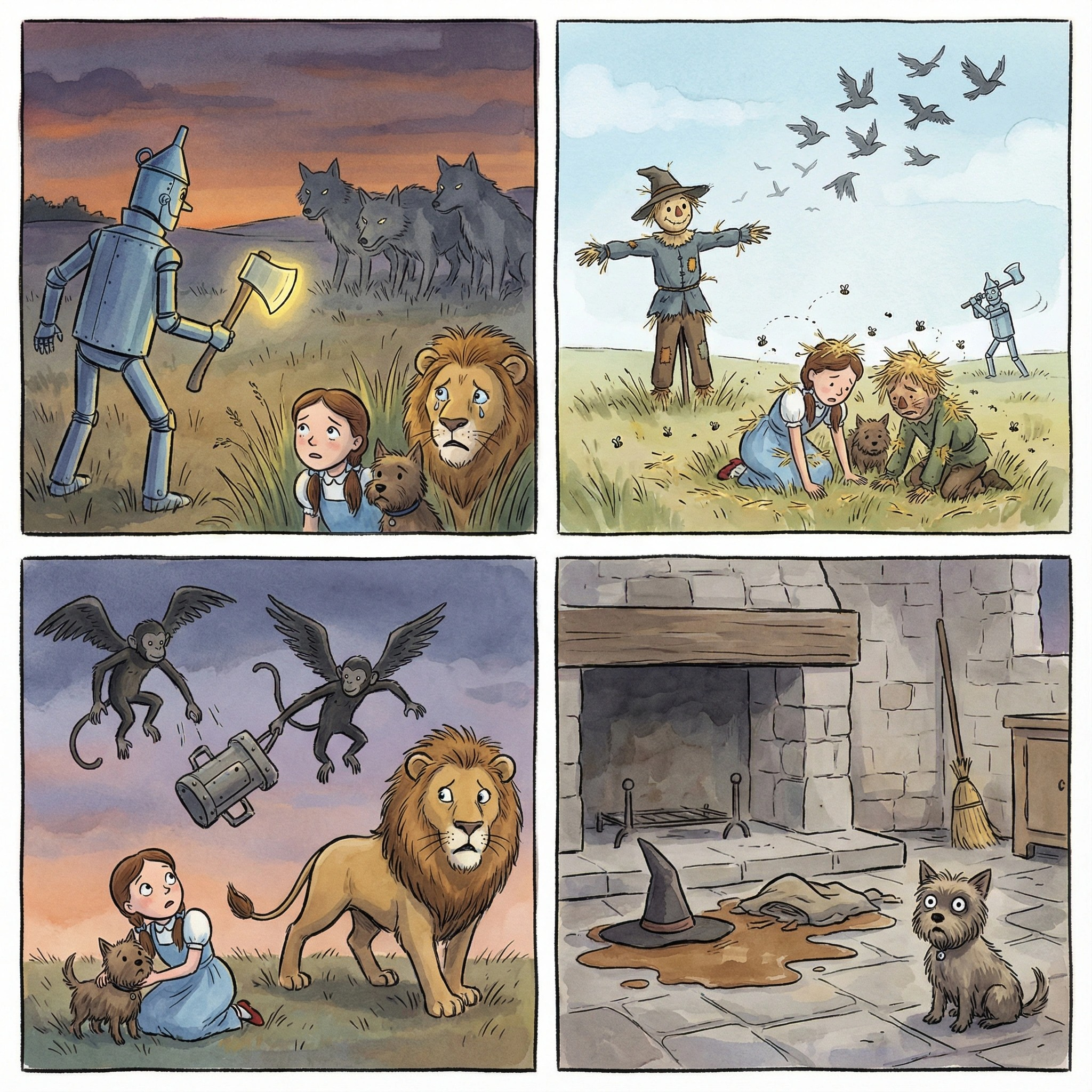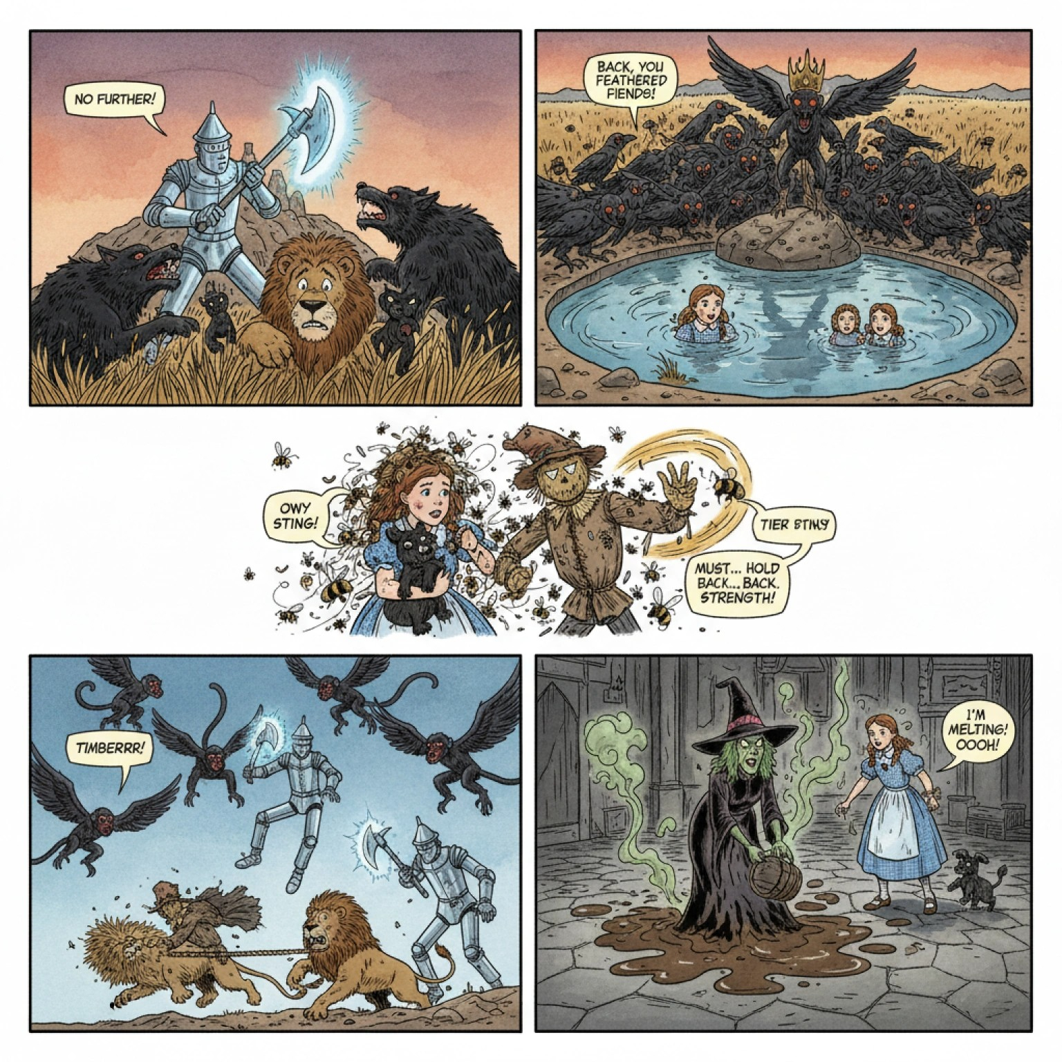 “이건 내 싸움이야.” 양철나무꾼이 말했다. “그러니 내 뒤로 숨어. 녀석들이 오면 내가 맞서 싸우겠어.”