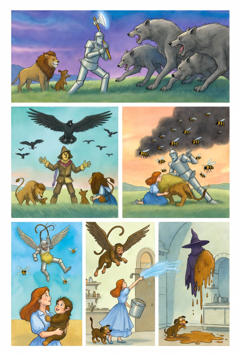 서쪽의 사악한 마녀는, 자기의 검은 벌들이 작은 숯더미처럼 바닥에 널려 있는 것을 보고 몹시 화가 났다. 그녀는 발을 구르고 머리카락을 쥐어뜯었으며, 이를 갈았다. 그러고 나서 윙키들 가운데에서 노예 열두 명을 불러, 날이 선 창을 쥐어 주며 이방인들에게 가서 그들을 없애라고 명령했다.