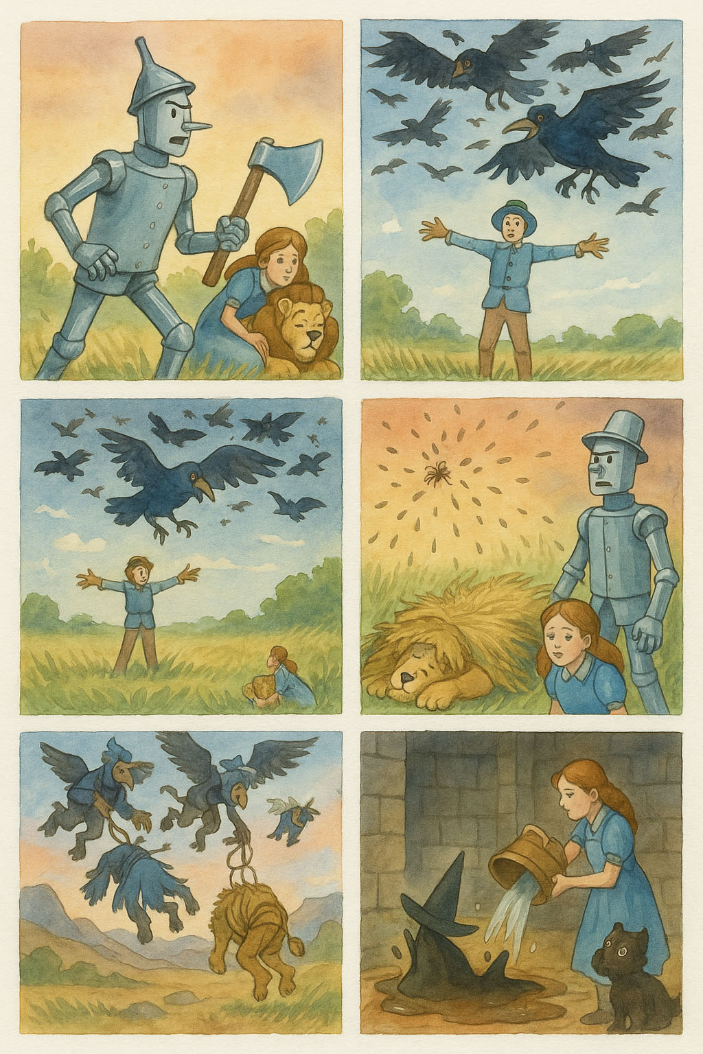 들까마귀들은 한 거대한 무리를 이루어 도로시와 동행들을 향해 날아왔다. 작은 소녀는 까마귀 떼가 다가오는 것을 보고 두려움에 사로잡혔다.