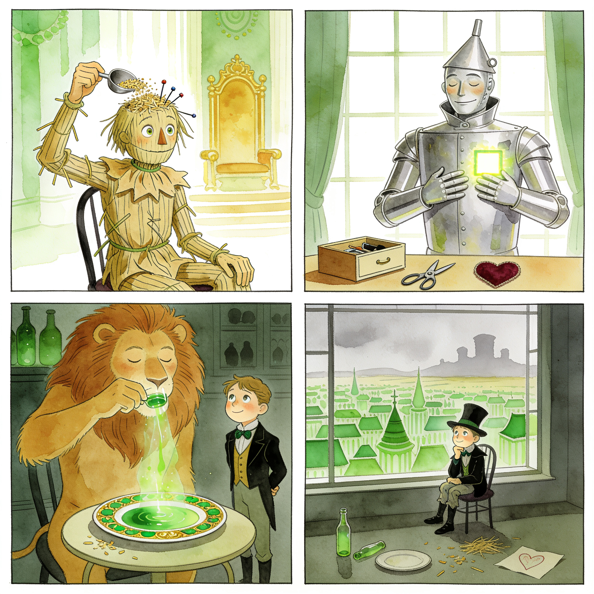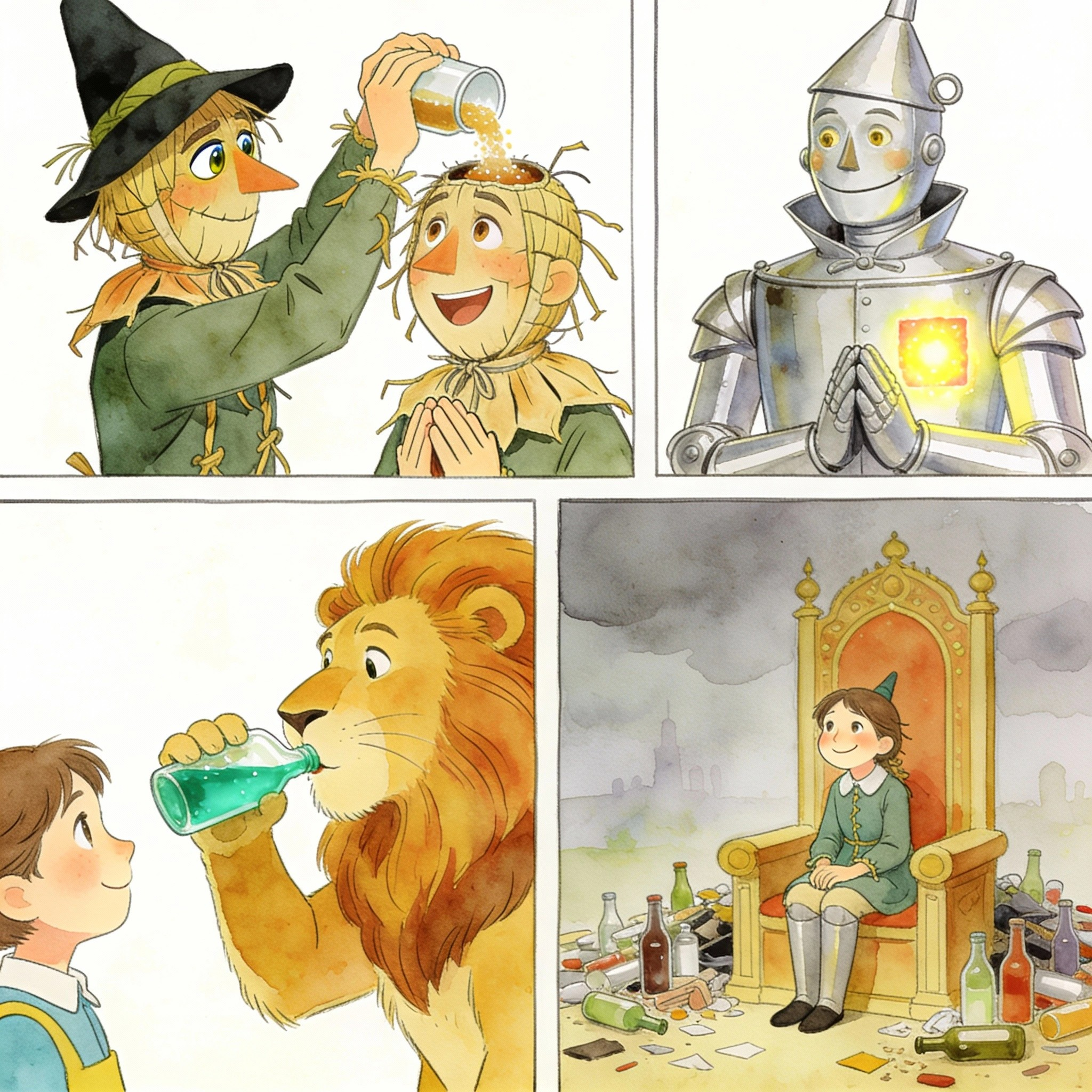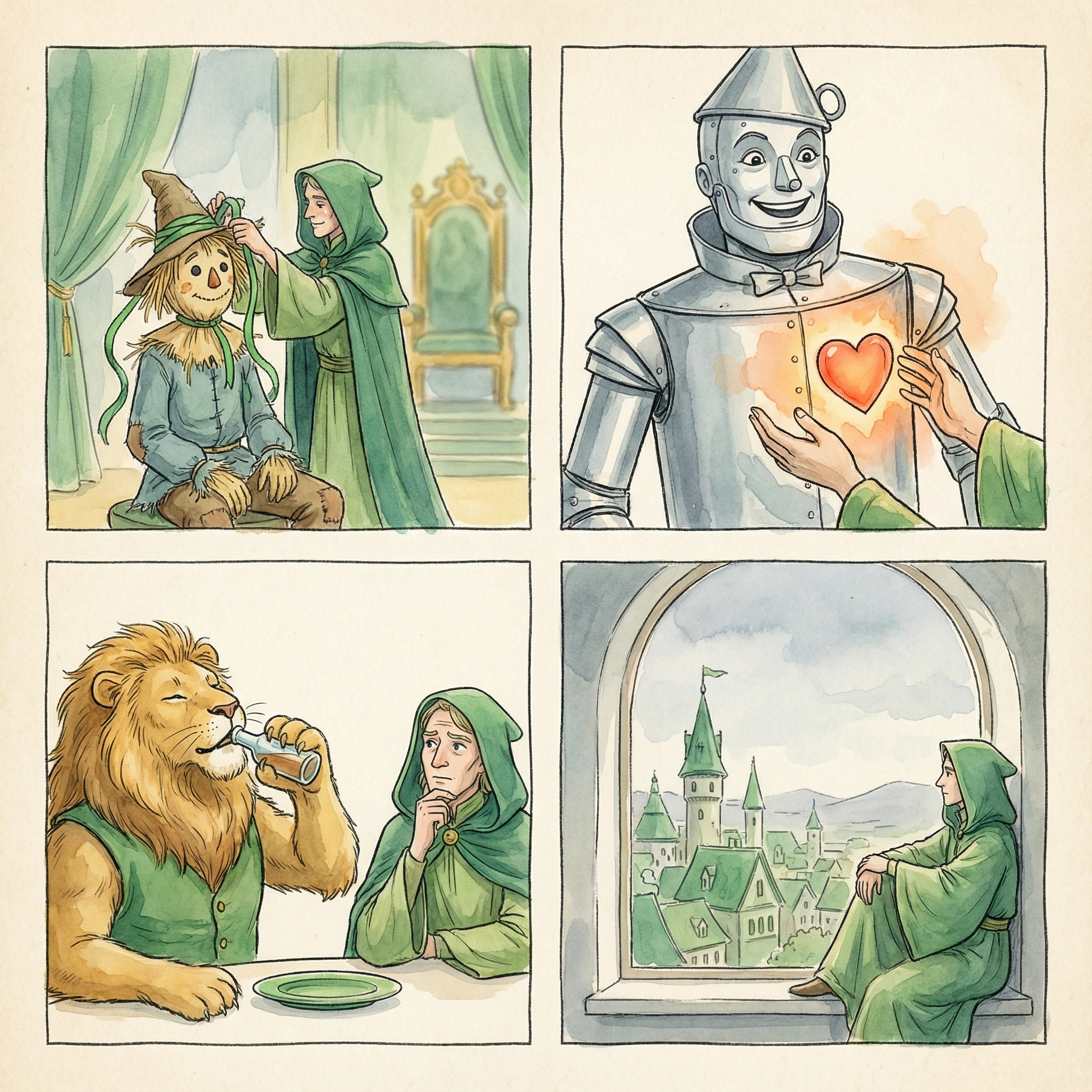 홀로 남게 된 오즈는, 허수아비와 양철나무꾼과 사자에게 그들이 원한다고 생각했던 것을 정확히 주는 데 성공한 것을 떠올리며 미소 지었다.