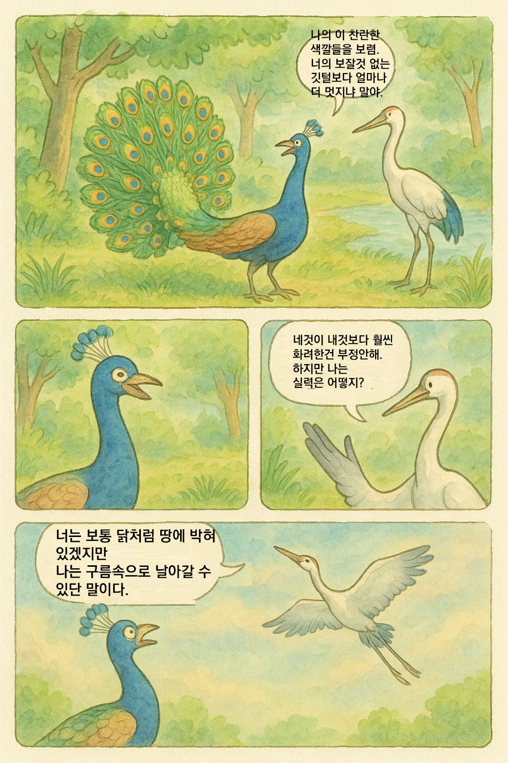 "나의 이 찬란한 색깔들을 보렴. 너의 보잘것 없는 깃털보다 얼마나 더 멋지냐 말야."