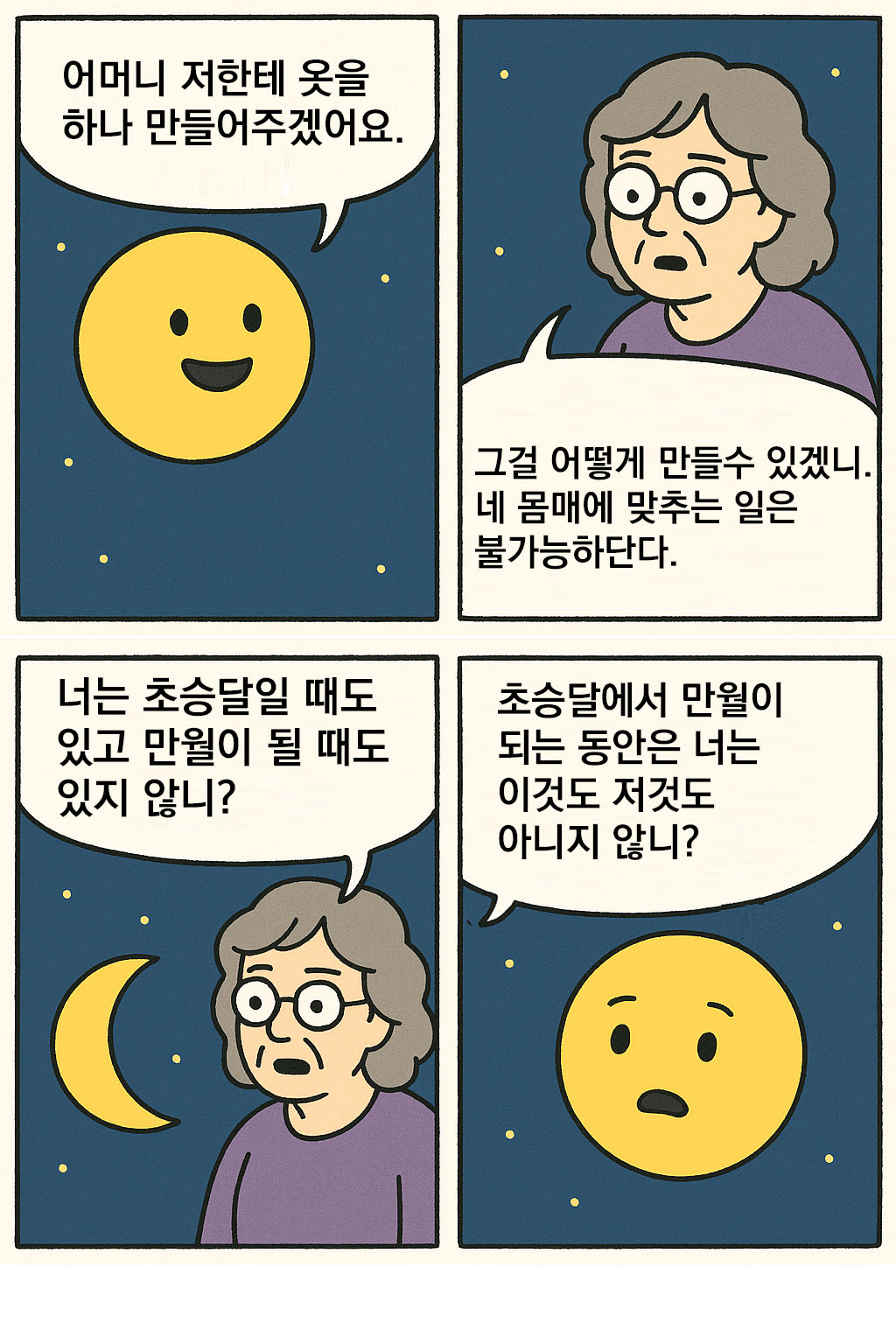 ”그걸 어떻게 만들수 있겠니. 네 몸매에 맞추는 일은 불가능하단다. 너는 초승달일 때도 있고 만월이 될 때도 있지 않니? 초승달에서 만월이 되는 동안은 너는 이것도 저것도 아니지 않니?"
