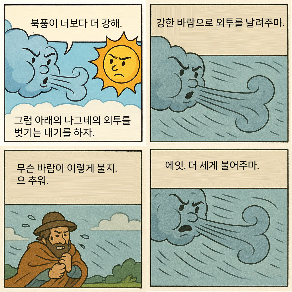 마침내 그들은 어느 여행자의 망토를 누가 더 빨리 벗길 수 있는지 시험해 보기로 했습니다.