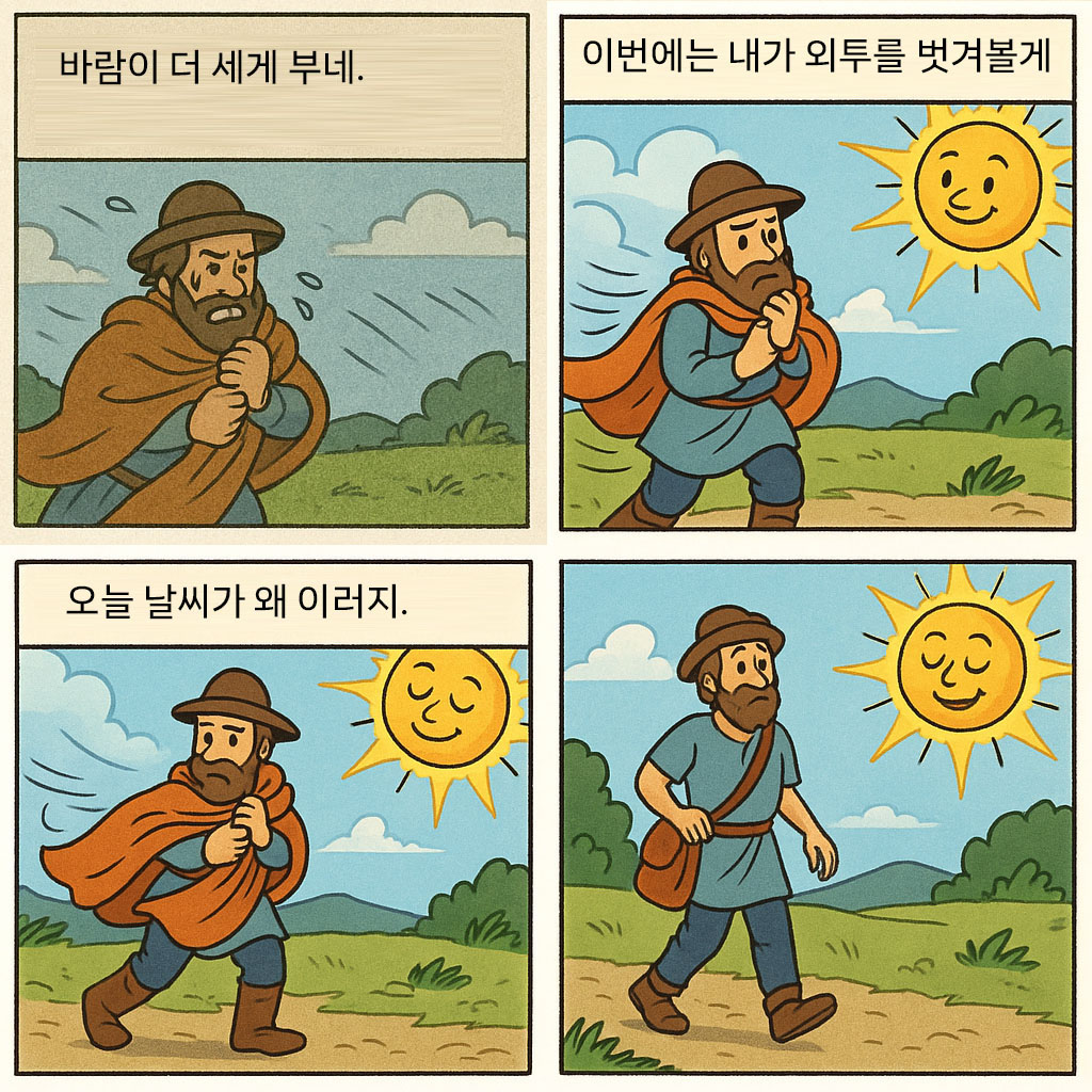 그러자 태양이 온 힘을 다해 빛을 발했고, 남자는 몇 걸음도 채 가지 못하고 망토를 벗어던지고 더 가볍게 걸었습니다.