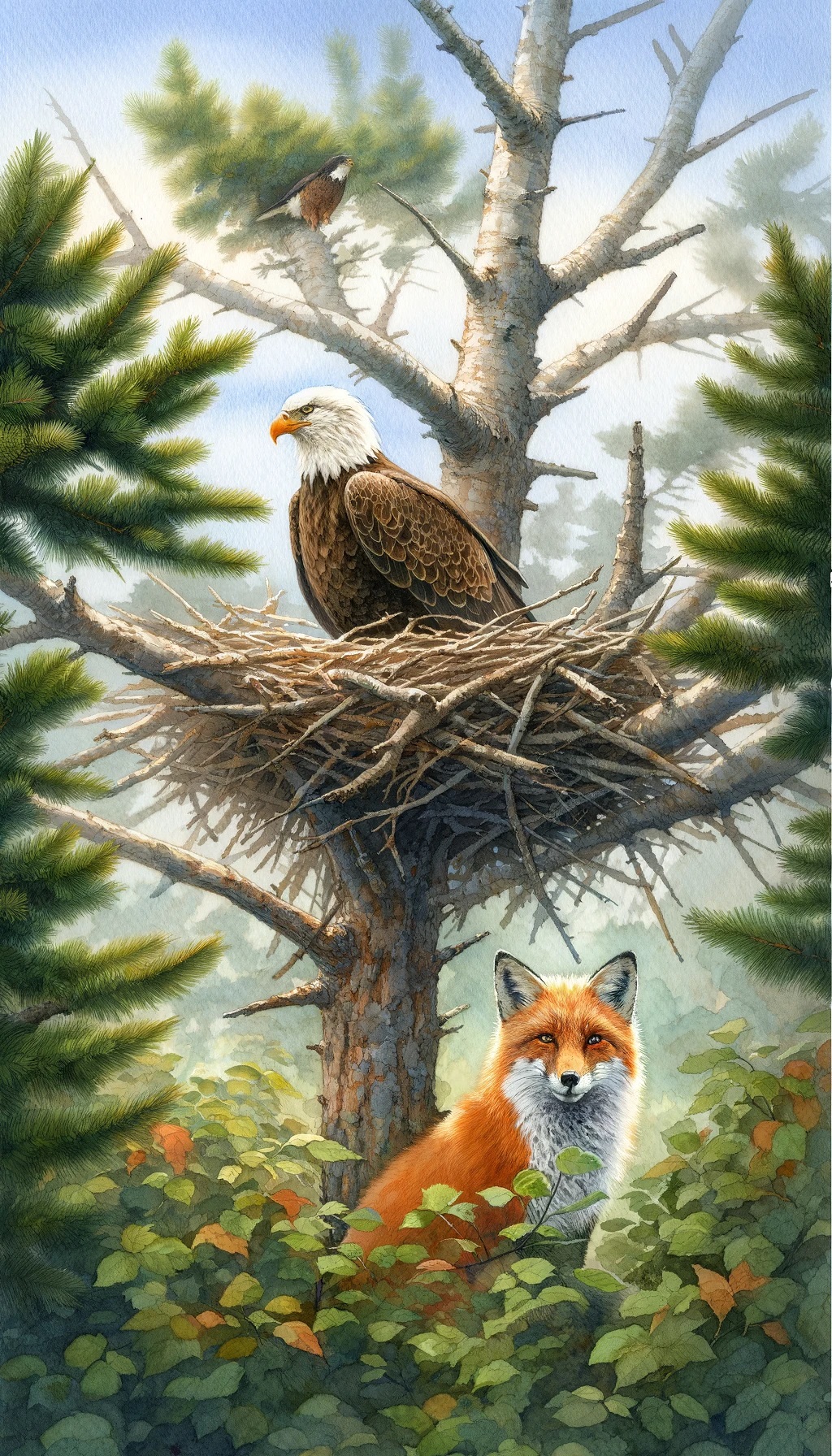 독수리와 여우는 친밀한 우정을 쌓았고 서로 가까이 살기로 결정했습니다. 독수리는 큰 나무 가지에 둥지를 틀었고, 여우는 덤불 속으로 살금살금 들어가 새끼를 낳았습니다. 그들이 이 계획에 동의한 지 얼마 지나지 않아, 새끼들을 위한 양식이 부족한 독수리는 여우가 밖에 있는 동안 급습하여 어린 새끼 중 하나를 붙잡고 자신과 새끼과 잡아먹었습니다.