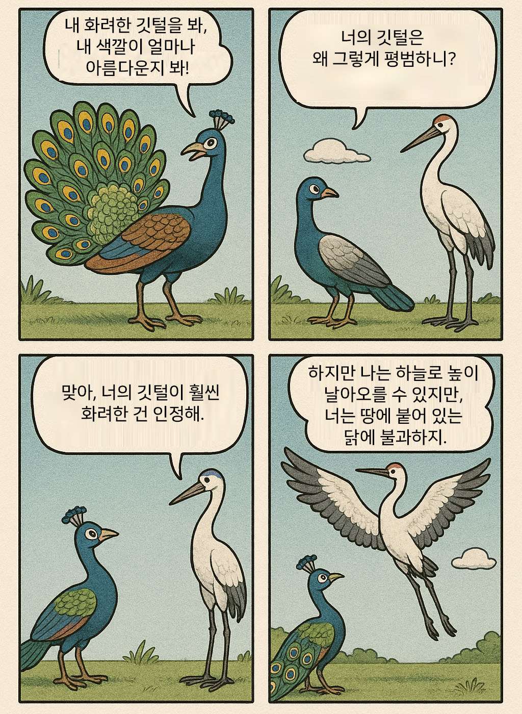 “내 화려한 깃털을 봐, 내 색깔이 얼마나 아름다운지 봐! 너의 깃털은 왜 그렇게 평범하니?”
