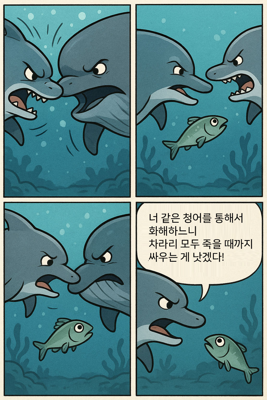 돌고래들은 고래들과 다투었고, 얼마 지나지 않아 서로 싸우기 시작했습니다.