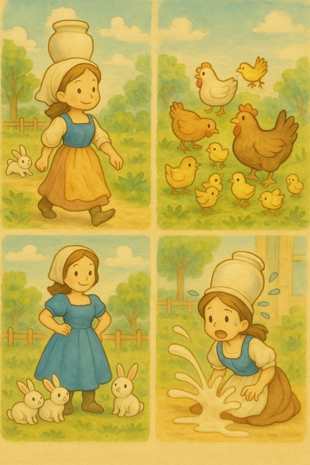Down went the pail, all the milk was spilled, and all her fine castles in the air vanished in a moment!
