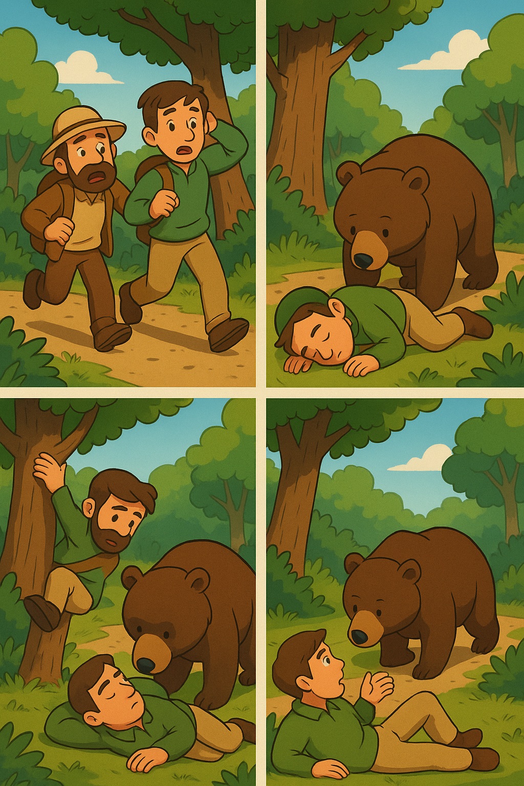 곰이 그들을 발견하기 전에, 그중 한 사람은 재빨리 길가의 나무 위로 올라가 가지 사이에 숨었습니다.