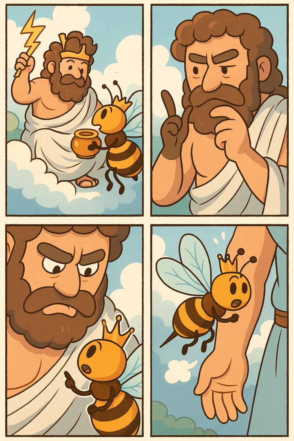 A Queen Bee from Hymettus flew up to Olympus with some fresh honey from the hive as a present to Jupiter, who was so pleased with the gift that he promised to give her anything she liked to ask for.