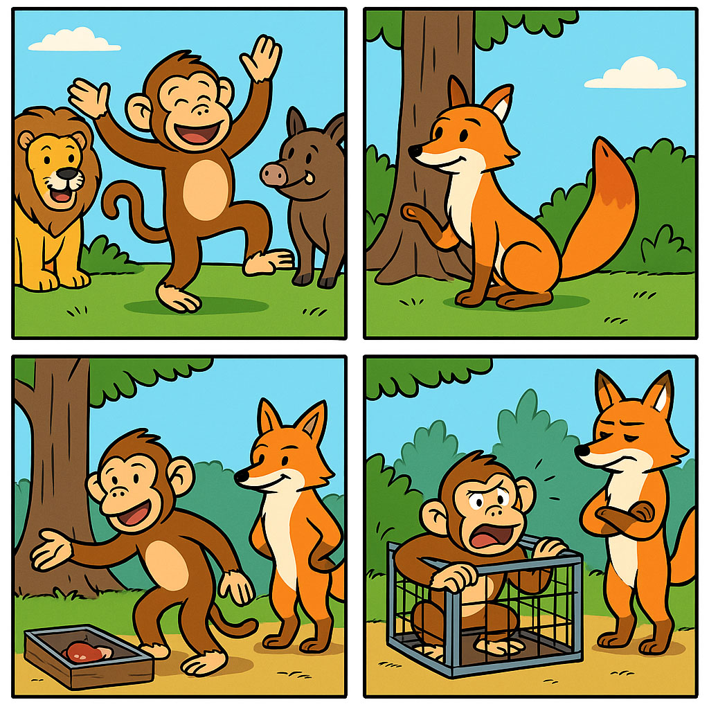 그래서 어느 날 덫에 고기 한 조각이 놓여 있는 것을 발견하자, 원숭이를 그곳으로 데리고 가 말했습니다.